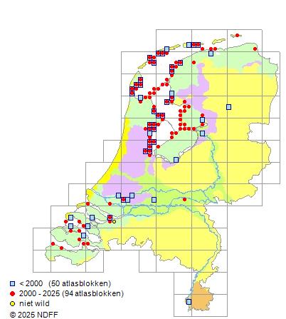 Het aantal atlasblokken (5x5 km) waarin de soort is gemeld binnen een periode van vijf jaar (vanaf 1980) of twintig jaar. Niet gecorrigeerd voor waarnemersinspanning en het aantal doorgegeven waarnemingen kan sterk variëren per periode, dus een trend in verspreiding kan hier niet direct uit worden afgelezen. Het opgegeven jaartal is het eerste jaar van de periode. Bron: gevalideerde waarnemingen uit de NDFF.