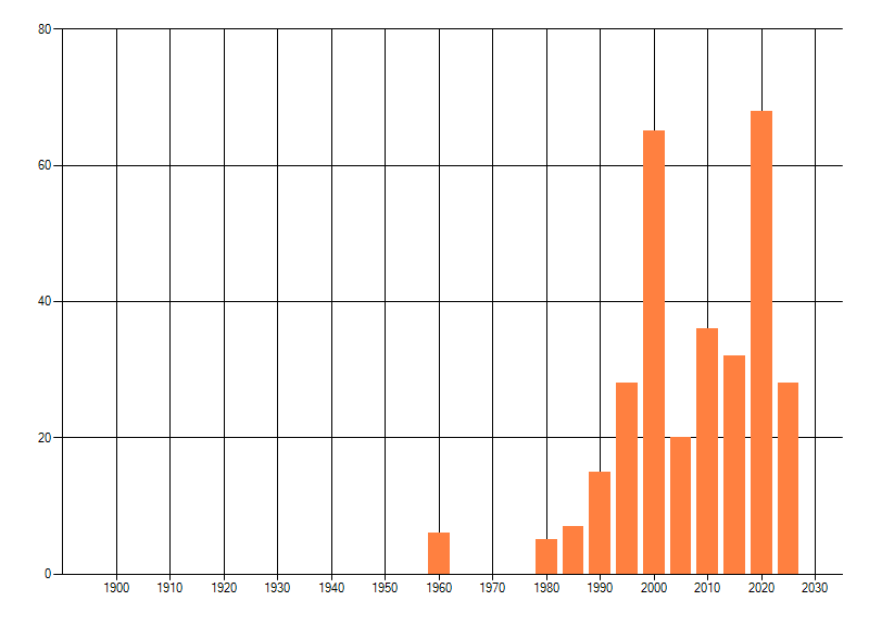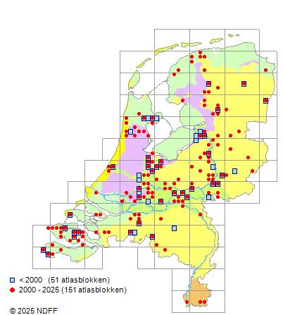 Het aantal atlasblokken (5x5 km) waarin de soort is gemeld binnen een periode van vijf jaar (vanaf 1980) of twintig jaar. Niet gecorrigeerd voor waarnemersinspanning en het aantal doorgegeven waarnemingen kan sterk variëren per periode, dus een trend in verspreiding kan hier niet direct uit worden afgelezen. Het opgegeven jaartal is het eerste jaar van de periode. Bron: gevalideerde waarnemingen uit de NDFF.