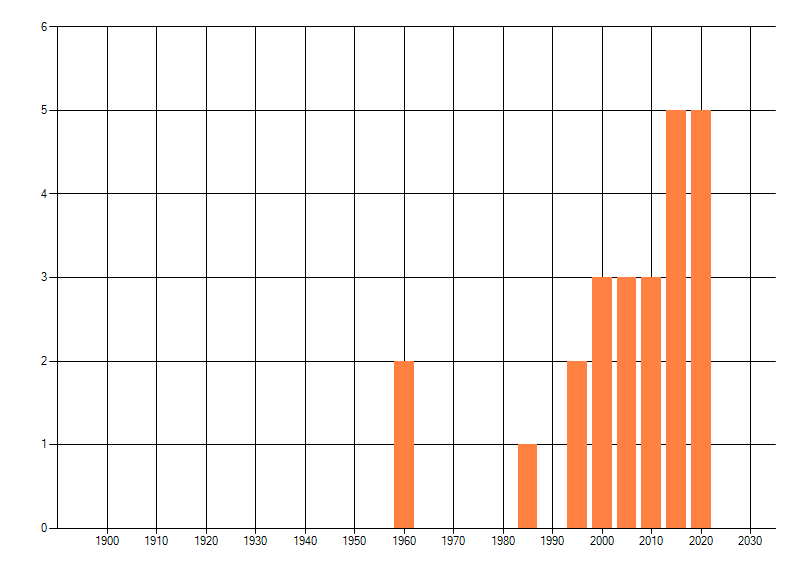 Het aantal atlasblokken (5x5 km) waarin de soort is gemeld binnen een periode van vijf jaar (vanaf 1980) of twintig jaar. Niet gecorrigeerd voor waarnemersinspanning en het aantal doorgegeven waarnemingen kan sterk variëren per periode, dus een trend in verspreiding kan hier niet direct uit worden afgelezen. Het opgegeven jaartal is het eerste jaar van de periode. Bron: gevalideerde waarnemingen uit de NDFF.