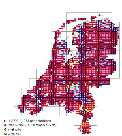 Het aantal atlasblokken (5x5 km) waarin de soort is gemeld binnen een periode van vijf jaar (vanaf 1980) of twintig jaar. Niet gecorrigeerd voor waarnemersinspanning en het aantal doorgegeven waarnemingen kan sterk variëren per periode, dus een trend in verspreiding kan hier niet direct uit worden afgelezen. Het opgegeven jaartal is het eerste jaar van de periode. Bron: gevalideerde waarnemingen uit de NDFF.