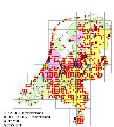 Het aantal atlasblokken (5x5 km) waarin de soort is gemeld binnen een periode van vijf jaar (vanaf 1980) of twintig jaar. Niet gecorrigeerd voor waarnemersinspanning en het aantal doorgegeven waarnemingen kan sterk variëren per periode, dus een trend in verspreiding kan hier niet direct uit worden afgelezen. Het opgegeven jaartal is het eerste jaar van de periode. Bron: gevalideerde waarnemingen uit de NDFF.