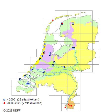 Het aantal atlasblokken (5x5 km) waarin de soort is gemeld binnen een periode van vijf jaar (vanaf 1980) of twintig jaar. Niet gecorrigeerd voor waarnemersinspanning en het aantal doorgegeven waarnemingen kan sterk variëren per periode, dus een trend in verspreiding kan hier niet direct uit worden afgelezen. Het opgegeven jaartal is het eerste jaar van de periode. Bron: gevalideerde waarnemingen uit de NDFF.