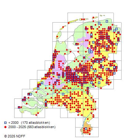 Het aantal atlasblokken (5x5 km) waarin de soort is gemeld binnen een periode van vijf jaar (vanaf 1980) of twintig jaar. Niet gecorrigeerd voor waarnemersinspanning en het aantal doorgegeven waarnemingen kan sterk variëren per periode, dus een trend in verspreiding kan hier niet direct uit worden afgelezen. Het opgegeven jaartal is het eerste jaar van de periode. Bron: gevalideerde waarnemingen uit de NDFF.