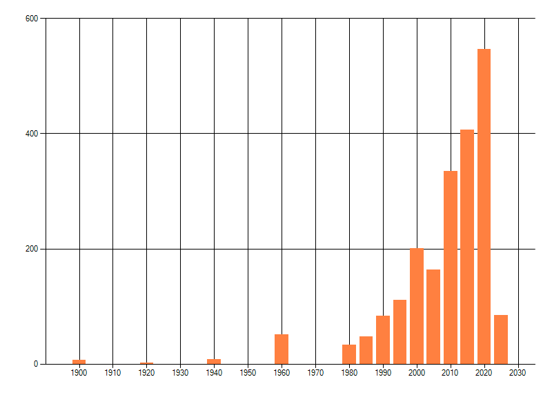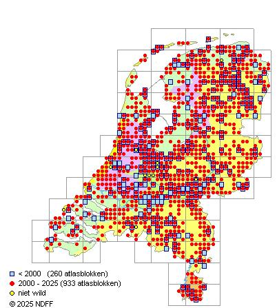 Het aantal atlasblokken (5x5 km) waarin de soort is gemeld binnen een periode van vijf jaar (vanaf 1980) of twintig jaar. Niet gecorrigeerd voor waarnemersinspanning en het aantal doorgegeven waarnemingen kan sterk variëren per periode, dus een trend in verspreiding kan hier niet direct uit worden afgelezen. Het opgegeven jaartal is het eerste jaar van de periode. Bron: gevalideerde waarnemingen uit de NDFF.
