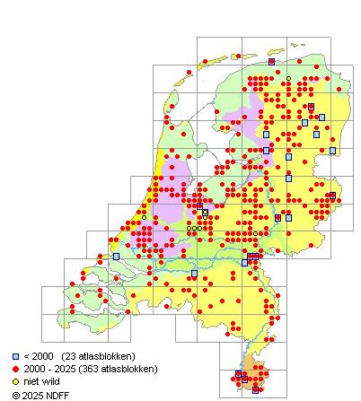 Het geschatte aantal atlasblokken (5x5 km) waarin de soort voorkomt per periode van vijf jaar. Bron: A. Aptroot et al. Basisrapport Rode Lijst Korstmossen 2011 © BLWG 2012.
