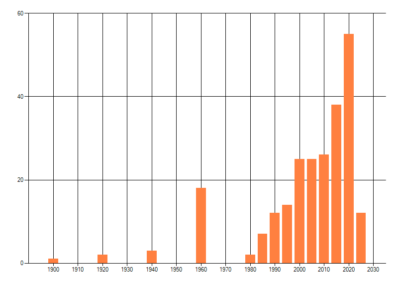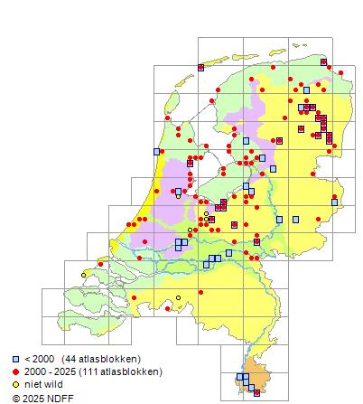 Het aantal atlasblokken (5x5 km) waarin de soort is gemeld binnen een periode van vijf jaar (vanaf 1980) of twintig jaar. Niet gecorrigeerd voor waarnemersinspanning en het aantal doorgegeven waarnemingen kan sterk variëren per periode, dus een trend in verspreiding kan hier niet direct uit worden afgelezen. Het opgegeven jaartal is het eerste jaar van de periode. Bron: gevalideerde waarnemingen uit de NDFF.