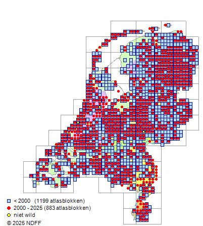 Het aantal atlasblokken (5x5 km) waarin de soort is gemeld binnen een periode van vijf jaar (vanaf 1980) of twintig jaar. Niet gecorrigeerd voor waarnemersinspanning en het aantal doorgegeven waarnemingen kan sterk variëren per periode, dus een trend in verspreiding kan hier niet direct uit worden afgelezen. Het opgegeven jaartal is het eerste jaar van de periode. Bron: gevalideerde waarnemingen uit de NDFF.