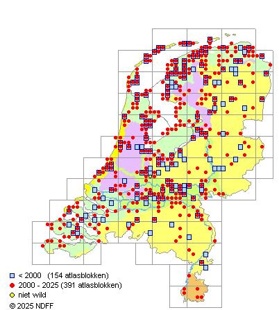 Het aantal atlasblokken (5x5 km) waarin de soort is gemeld binnen een periode van vijf jaar (vanaf 1980) of twintig jaar. Niet gecorrigeerd voor waarnemersinspanning en het aantal doorgegeven waarnemingen kan sterk variƫren per periode, dus een trend in verspreiding kan hier niet direct uit worden afgelezen. Het opgegeven jaartal is het eerste jaar van de periode. Bron: gevalideerde waarnemingen uit de NDFF.