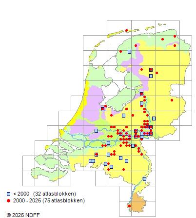 Het aantal atlasblokken (5x5 km) waarin de soort is gemeld binnen een periode van vijf jaar (vanaf 1980) of twintig jaar. Niet gecorrigeerd voor waarnemersinspanning en het aantal doorgegeven waarnemingen kan sterk variëren per periode, dus een trend in verspreiding kan hier niet direct uit worden afgelezen. Het opgegeven jaartal is het eerste jaar van de periode. Bron: gevalideerde waarnemingen uit de NDFF.