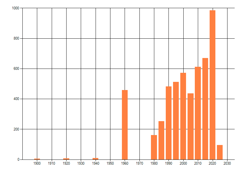 Het aantal atlasblokken (5x5 km) waarin de soort is gemeld binnen een periode van vijf jaar (vanaf 1980) of twintig jaar. Niet gecorrigeerd voor waarnemersinspanning en het aantal doorgegeven waarnemingen kan sterk variëren per periode, dus een trend in verspreiding kan hier niet direct uit worden afgelezen. Het opgegeven jaartal is het eerste jaar van de periode. Bron: gevalideerde waarnemingen uit de NDFF.