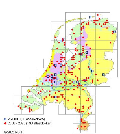 Het aantal atlasblokken (5x5 km) waarin de soort is gemeld binnen een periode van vijf jaar (vanaf 1980) of twintig jaar. Niet gecorrigeerd voor waarnemersinspanning en het aantal doorgegeven waarnemingen kan sterk variëren per periode, dus een trend in verspreiding kan hier niet direct uit worden afgelezen. Het opgegeven jaartal is het eerste jaar van de periode. Bron: gevalideerde waarnemingen uit de NDFF.