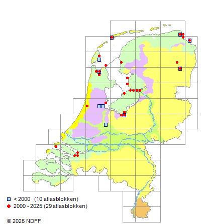Het aantal atlasblokken (5x5 km) waarin de soort is gemeld binnen een periode van vijf jaar (vanaf 1980) of twintig jaar. Niet gecorrigeerd voor waarnemersinspanning en het aantal doorgegeven waarnemingen kan sterk variëren per periode, dus een trend in verspreiding kan hier niet direct uit worden afgelezen. Het opgegeven jaartal is het eerste jaar van de periode. Bron: gevalideerde waarnemingen uit de NDFF.