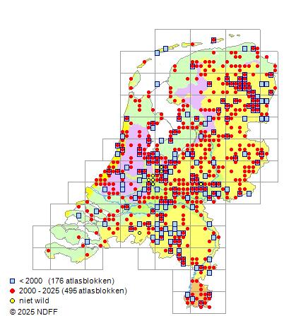 Het aantal atlasblokken (5x5 km) waarin de soort is gemeld binnen een periode van vijf jaar (vanaf 1980) of twintig jaar. Niet gecorrigeerd voor waarnemersinspanning en het aantal doorgegeven waarnemingen kan sterk variëren per periode, dus een trend in verspreiding kan hier niet direct uit worden afgelezen. Het opgegeven jaartal is het eerste jaar van de periode. Bron: gevalideerde waarnemingen uit de NDFF.