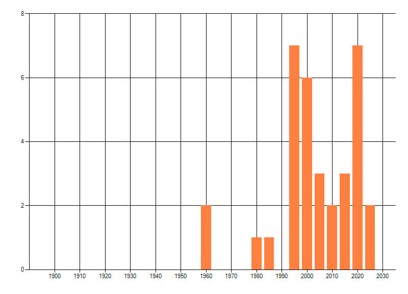 Het aantal atlasblokken (5x5 km) waarin de soort is gemeld binnen een periode van vijf jaar (vanaf 1980) of twintig jaar. Niet gecorrigeerd voor waarnemersinspanning en het aantal doorgegeven waarnemingen kan sterk variëren per periode, dus een trend in verspreiding kan hier niet direct uit worden afgelezen. Het opgegeven jaartal is het eerste jaar van de periode. Bron: gevalideerde waarnemingen uit de NDFF.