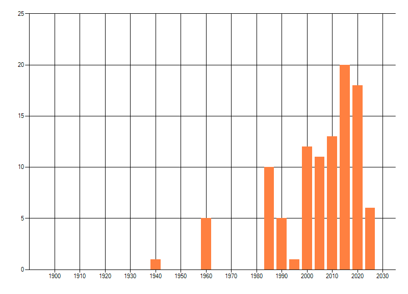 Het aantal atlasblokken (5x5 km) waarin de soort is gemeld binnen een periode van vijf jaar (vanaf 1980) of twintig jaar. Niet gecorrigeerd voor waarnemersinspanning en het aantal doorgegeven waarnemingen kan sterk variëren per periode, dus een trend in verspreiding kan hier niet direct uit worden afgelezen. Het opgegeven jaartal is het eerste jaar van de periode. Bron: gevalideerde waarnemingen uit de NDFF.