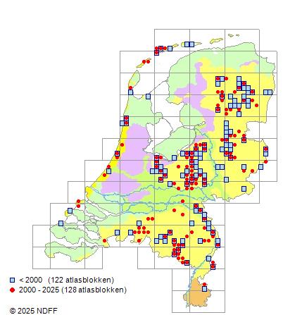 Het aantal atlasblokken (5x5 km) waarin de soort is gemeld binnen een periode van vijf jaar (vanaf 1980) of twintig jaar. Niet gecorrigeerd voor waarnemersinspanning en het aantal doorgegeven waarnemingen kan sterk variëren per periode, dus een trend in verspreiding kan hier niet direct uit worden afgelezen. Het opgegeven jaartal is het eerste jaar van de periode. Bron: gevalideerde waarnemingen uit de NDFF.