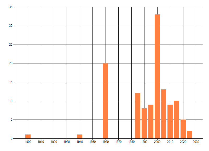 Het aantal atlasblokken (5x5 km) waarin de soort is gemeld binnen een periode van vijf jaar (vanaf 1980) of twintig jaar. Niet gecorrigeerd voor waarnemersinspanning en het aantal doorgegeven waarnemingen kan sterk variëren per periode, dus een trend in verspreiding kan hier niet direct uit worden afgelezen. Het opgegeven jaartal is het eerste jaar van de periode. Bron: gevalideerde waarnemingen uit de NDFF.