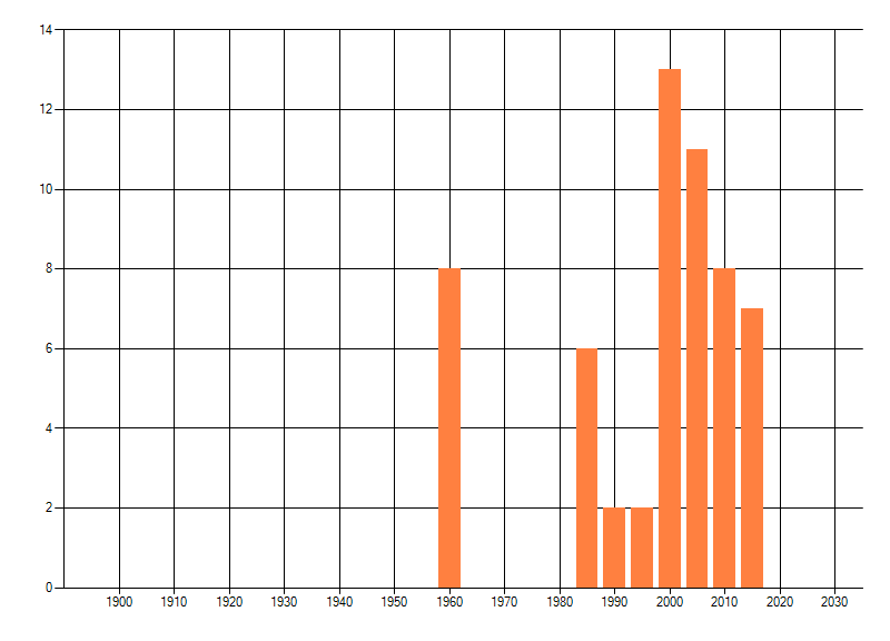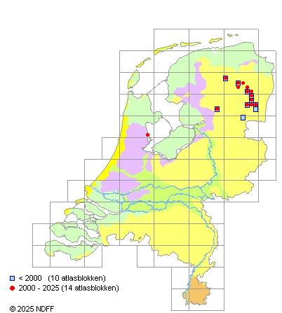 Het aantal atlasblokken (5x5 km) waarin de soort is gemeld binnen een periode van vijf jaar (vanaf 1980) of twintig jaar. Niet gecorrigeerd voor waarnemersinspanning en het aantal doorgegeven waarnemingen kan sterk variëren per periode, dus een trend in verspreiding kan hier niet direct uit worden afgelezen. Het opgegeven jaartal is het eerste jaar van de periode. Bron: gevalideerde waarnemingen uit de NDFF.