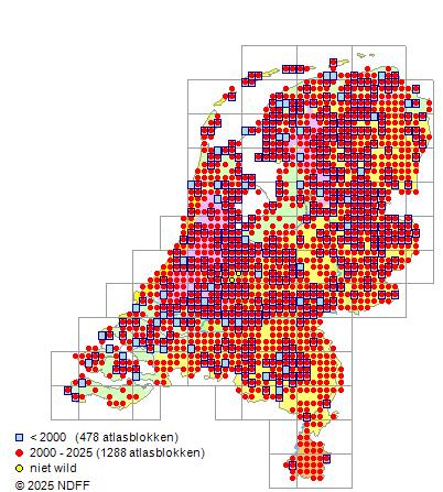 Het aantal atlasblokken (5x5 km) waarin de soort is gemeld binnen een periode van vijf jaar (vanaf 1980) of twintig jaar. Niet gecorrigeerd voor waarnemersinspanning en het aantal doorgegeven waarnemingen kan sterk variëren per periode, dus een trend in verspreiding kan hier niet direct uit worden afgelezen. Het opgegeven jaartal is het eerste jaar van de periode. Bron: gevalideerde waarnemingen uit de NDFF.