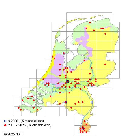 Het aantal atlasblokken (5x5 km) waarin de soort is gemeld binnen een periode van vijf jaar (vanaf 1980) of twintig jaar. Niet gecorrigeerd voor waarnemersinspanning en het aantal doorgegeven waarnemingen kan sterk variëren per periode, dus een trend in verspreiding kan hier niet direct uit worden afgelezen. Het opgegeven jaartal is het eerste jaar van de periode. Bron: gevalideerde waarnemingen uit de NDFF.