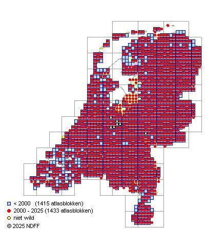 Het aantal atlasblokken (5x5 km) waarin de soort is gemeld binnen een periode van vijf jaar (vanaf 1980) of twintig jaar. Niet gecorrigeerd voor waarnemersinspanning en het aantal doorgegeven waarnemingen kan sterk variƫren per periode, dus een trend in verspreiding kan hier niet direct uit worden afgelezen. Het opgegeven jaartal is het eerste jaar van de periode. Bron: gevalideerde waarnemingen uit de NDFF.