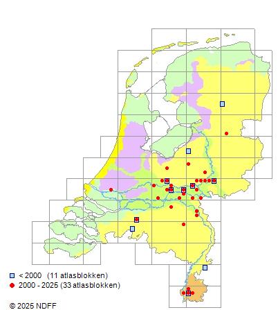 Het aantal atlasblokken (5x5 km) waarin de soort is gemeld binnen een periode van vijf jaar (vanaf 1980) of twintig jaar. Niet gecorrigeerd voor waarnemersinspanning en het aantal doorgegeven waarnemingen kan sterk variëren per periode, dus een trend in verspreiding kan hier niet direct uit worden afgelezen. Het opgegeven jaartal is het eerste jaar van de periode. Bron: gevalideerde waarnemingen uit de NDFF.