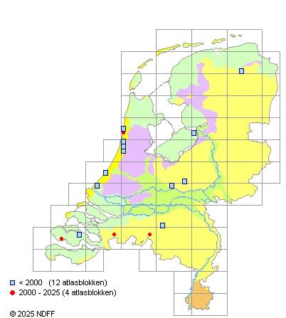 Het aantal atlasblokken (5x5 km) waarin de soort is gemeld binnen een periode van vijf jaar (vanaf 1980) of twintig jaar. Niet gecorrigeerd voor waarnemersinspanning en het aantal doorgegeven waarnemingen kan sterk variëren per periode, dus een trend in verspreiding kan hier niet direct uit worden afgelezen. Het opgegeven jaartal is het eerste jaar van de periode. Bron: gevalideerde waarnemingen uit de NDFF.