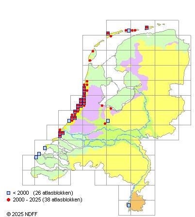 Het geschatte aantal atlasblokken (5x5 km) waarin de soort voorkomt per periode van vijf jaar. Bron: A. Aptroot et al. Basisrapport Rode Lijst Korstmossen 2011 © BLWG 2012.