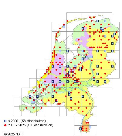 Het aantal atlasblokken (5x5 km) waarin de soort is gemeld binnen een periode van vijf jaar (vanaf 1980) of twintig jaar. Niet gecorrigeerd voor waarnemersinspanning en het aantal doorgegeven waarnemingen kan sterk variëren per periode, dus een trend in verspreiding kan hier niet direct uit worden afgelezen. Het opgegeven jaartal is het eerste jaar van de periode. Bron: gevalideerde waarnemingen uit de NDFF.