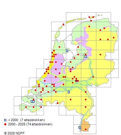 Het aantal atlasblokken (5x5 km) waarin de soort is gemeld binnen een periode van vijf jaar (vanaf 1980) of twintig jaar. Niet gecorrigeerd voor waarnemersinspanning en het aantal doorgegeven waarnemingen kan sterk variëren per periode, dus een trend in verspreiding kan hier niet direct uit worden afgelezen. Het opgegeven jaartal is het eerste jaar van de periode. Bron: gevalideerde waarnemingen uit de NDFF.