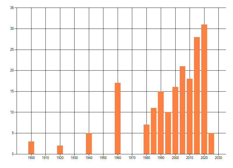 Het aantal atlasblokken (5x5 km) waarin de soort is gemeld binnen een periode van vijf jaar (vanaf 1980) of twintig jaar. Niet gecorrigeerd voor waarnemersinspanning en het aantal doorgegeven waarnemingen kan sterk variëren per periode, dus een trend in verspreiding kan hier niet direct uit worden afgelezen. Het opgegeven jaartal is het eerste jaar van de periode. Bron: gevalideerde waarnemingen uit de NDFF.
