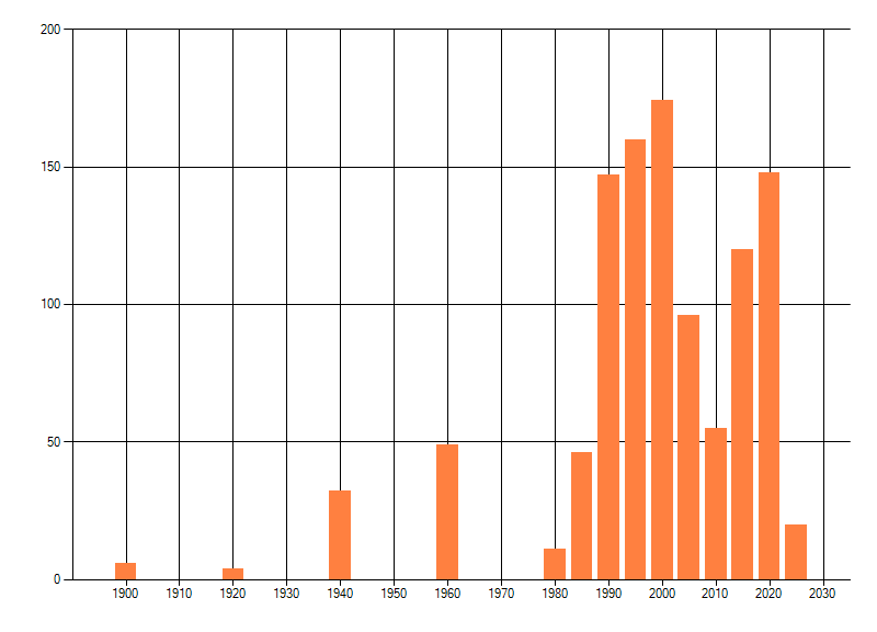 Het aantal atlasblokken (5x5 km) waarin de soort is gemeld binnen een periode van vijf jaar (vanaf 1980) of twintig jaar. Niet gecorrigeerd voor waarnemersinspanning en het aantal doorgegeven waarnemingen kan sterk variëren per periode, dus een trend in verspreiding kan hier niet direct uit worden afgelezen. Het opgegeven jaartal is het eerste jaar van de periode. Bron: gevalideerde waarnemingen uit de NDFF.