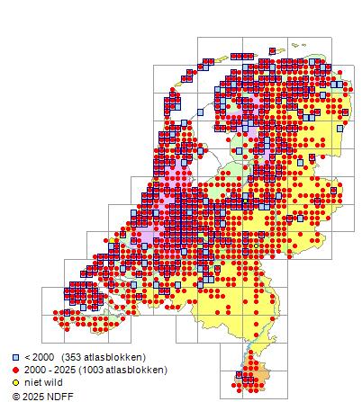 Het aantal atlasblokken (5x5 km) waarin de soort is gemeld binnen een periode van vijf jaar (vanaf 1980) of twintig jaar. Niet gecorrigeerd voor waarnemersinspanning en het aantal doorgegeven waarnemingen kan sterk variëren per periode, dus een trend in verspreiding kan hier niet direct uit worden afgelezen. Het opgegeven jaartal is het eerste jaar van de periode. Bron: gevalideerde waarnemingen uit de NDFF.