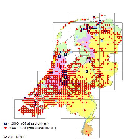 Het aantal atlasblokken (5x5 km) waarin de soort is gemeld binnen een periode van vijf jaar (vanaf 1980) of twintig jaar. Niet gecorrigeerd voor waarnemersinspanning en het aantal doorgegeven waarnemingen kan sterk variëren per periode, dus een trend in verspreiding kan hier niet direct uit worden afgelezen. Het opgegeven jaartal is het eerste jaar van de periode. Bron: gevalideerde waarnemingen uit de NDFF.