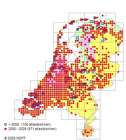 Het aantal atlasblokken (5x5 km) waarin de soort is gemeld binnen een periode van vijf jaar (vanaf 1980) of twintig jaar. Niet gecorrigeerd voor waarnemersinspanning en het aantal doorgegeven waarnemingen kan sterk variëren per periode, dus een trend in verspreiding kan hier niet direct uit worden afgelezen. Het opgegeven jaartal is het eerste jaar van de periode. Bron: gevalideerde waarnemingen uit de NDFF.