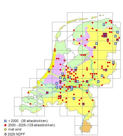 Het aantal atlasblokken (5x5 km) waarin de soort is gemeld binnen een periode van vijf jaar (vanaf 1980) of twintig jaar. Niet gecorrigeerd voor waarnemersinspanning en het aantal doorgegeven waarnemingen kan sterk variëren per periode, dus een trend in verspreiding kan hier niet direct uit worden afgelezen. Het opgegeven jaartal is het eerste jaar van de periode. Bron: gevalideerde waarnemingen uit de NDFF.