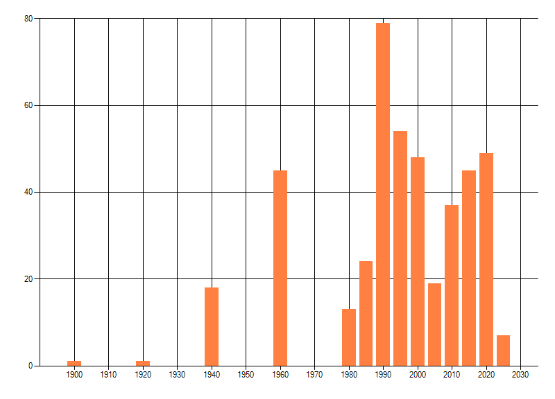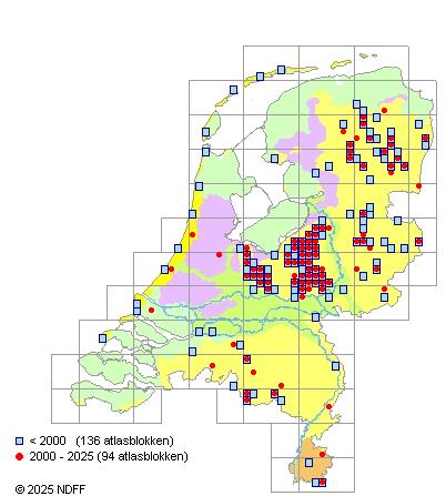 Het aantal atlasblokken (5x5 km) waarin de soort is gemeld binnen een periode van vijf jaar (vanaf 1980) of twintig jaar. Niet gecorrigeerd voor waarnemersinspanning en het aantal doorgegeven waarnemingen kan sterk variëren per periode, dus een trend in verspreiding kan hier niet direct uit worden afgelezen. Het opgegeven jaartal is het eerste jaar van de periode. Bron: gevalideerde waarnemingen uit de NDFF.