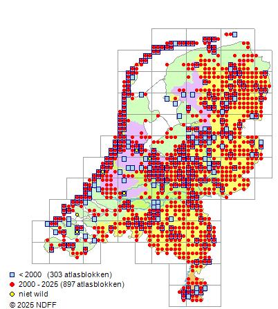 Het aantal atlasblokken (5x5 km) waarin de soort is gemeld binnen een periode van vijf jaar (vanaf 1980) of twintig jaar. Niet gecorrigeerd voor waarnemersinspanning en het aantal doorgegeven waarnemingen kan sterk variëren per periode, dus een trend in verspreiding kan hier niet direct uit worden afgelezen. Het opgegeven jaartal is het eerste jaar van de periode. Bron: gevalideerde waarnemingen uit de NDFF.