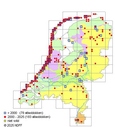 Het aantal atlasblokken (5x5 km) waarin de soort is gemeld binnen een periode van vijf jaar (vanaf 1980) of twintig jaar. Niet gecorrigeerd voor waarnemersinspanning en het aantal doorgegeven waarnemingen kan sterk variƫren per periode, dus een trend in verspreiding kan hier niet direct uit worden afgelezen. Het opgegeven jaartal is het eerste jaar van de periode. Bron: gevalideerde waarnemingen uit de NDFF.