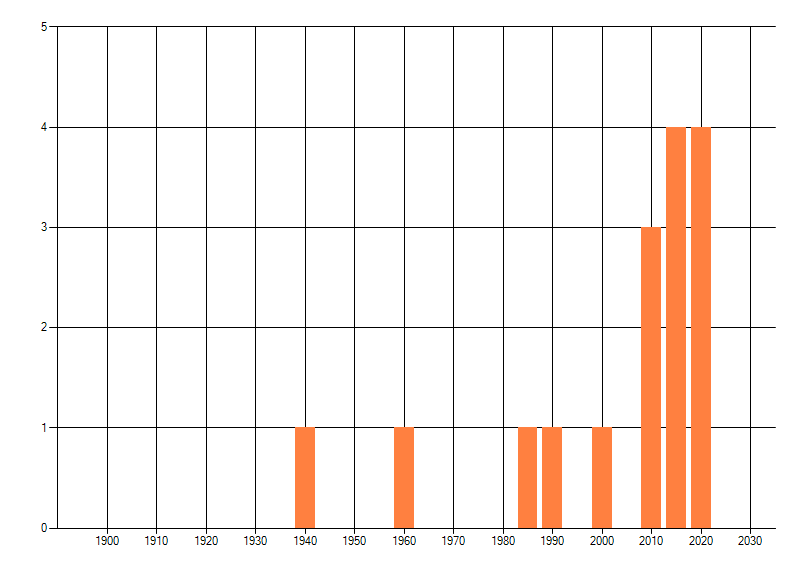 Het aantal atlasblokken (5x5 km) waarin de soort is gemeld binnen een periode van vijf jaar (vanaf 1980) of twintig jaar. Niet gecorrigeerd voor waarnemersinspanning en het aantal doorgegeven waarnemingen kan sterk variëren per periode, dus een trend in verspreiding kan hier niet direct uit worden afgelezen. Het opgegeven jaartal is het eerste jaar van de periode. Bron: gevalideerde waarnemingen uit de NDFF.