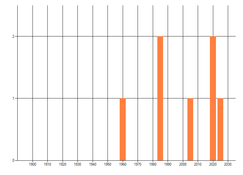 Het aantal atlasblokken (5x5 km) waarin de soort is gemeld binnen een periode van vijf jaar (vanaf 1980) of twintig jaar. Niet gecorrigeerd voor waarnemersinspanning en het aantal doorgegeven waarnemingen kan sterk variëren per periode, dus een trend in verspreiding kan hier niet direct uit worden afgelezen. Het opgegeven jaartal is het eerste jaar van de periode. Bron: gevalideerde waarnemingen uit de NDFF.