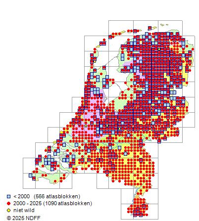 Het aantal atlasblokken (5x5 km) waarin de soort is gemeld binnen een periode van vijf jaar (vanaf 1980) of twintig jaar. Niet gecorrigeerd voor waarnemersinspanning en het aantal doorgegeven waarnemingen kan sterk variëren per periode, dus een trend in verspreiding kan hier niet direct uit worden afgelezen. Het opgegeven jaartal is het eerste jaar van de periode. Bron: gevalideerde waarnemingen uit de NDFF.