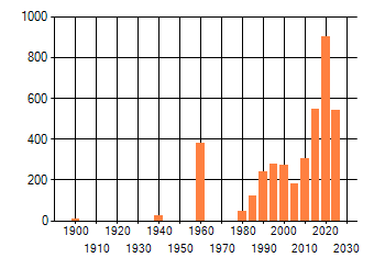 Het aantal atlasblokken (5x5 km) waarin de soort is gemeld binnen een periode van vijf jaar (vanaf 1980) of twintig jaar. Niet gecorrigeerd voor waarnemersinspanning en het aantal doorgegeven waarnemingen kan sterk variëren per periode, dus een trend in verspreiding kan hier niet direct uit worden afgelezen. Het opgegeven jaartal is het eerste jaar van de periode. Bron: gevalideerde waarnemingen uit de NDFF.