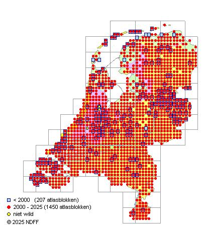 Het aantal atlasblokken (5x5 km) waarin de soort is gemeld binnen een periode van vijf jaar (vanaf 1980) of twintig jaar. Niet gecorrigeerd voor waarnemersinspanning en het aantal doorgegeven waarnemingen kan sterk variëren per periode, dus een trend in verspreiding kan hier niet direct uit worden afgelezen. Het opgegeven jaartal is het eerste jaar van de periode. Bron: gevalideerde waarnemingen uit de NDFF.