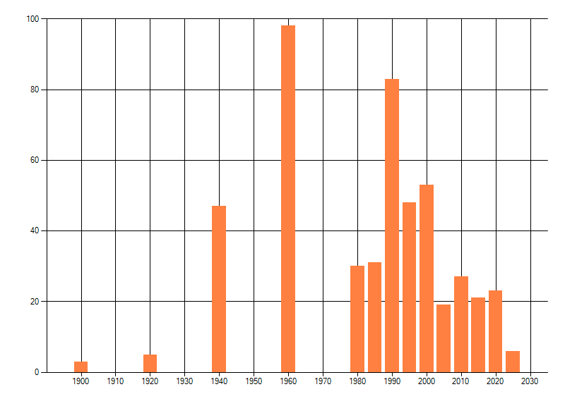 Het aantal atlasblokken (5x5 km) waarin de soort is gemeld binnen een periode van vijf jaar (vanaf 1980) of twintig jaar. Niet gecorrigeerd voor waarnemersinspanning en het aantal doorgegeven waarnemingen kan sterk variëren per periode, dus een trend in verspreiding kan hier niet direct uit worden afgelezen. Het opgegeven jaartal is het eerste jaar van de periode. Bron: gevalideerde waarnemingen uit de NDFF.