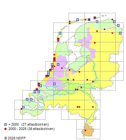 Het aantal atlasblokken (5x5 km) waarin de soort is gemeld binnen een periode van vijf jaar (vanaf 1980) of twintig jaar. Niet gecorrigeerd voor waarnemersinspanning en het aantal doorgegeven waarnemingen kan sterk variëren per periode, dus een trend in verspreiding kan hier niet direct uit worden afgelezen. Het opgegeven jaartal is het eerste jaar van de periode. Bron: gevalideerde waarnemingen uit de NDFF.