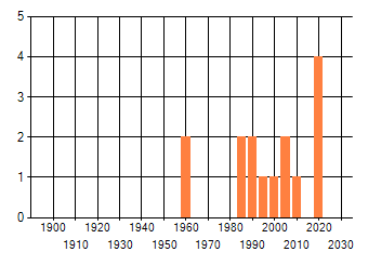 Het aantal atlasblokken (5x5 km) waarin de soort is gemeld binnen een periode van vijf jaar (vanaf 1980) of twintig jaar. Niet gecorrigeerd voor waarnemersinspanning en het aantal doorgegeven waarnemingen kan sterk variëren per periode, dus een trend in verspreiding kan hier niet direct uit worden afgelezen. Het opgegeven jaartal is het eerste jaar van de periode. Bron: gevalideerde waarnemingen uit de NDFF.