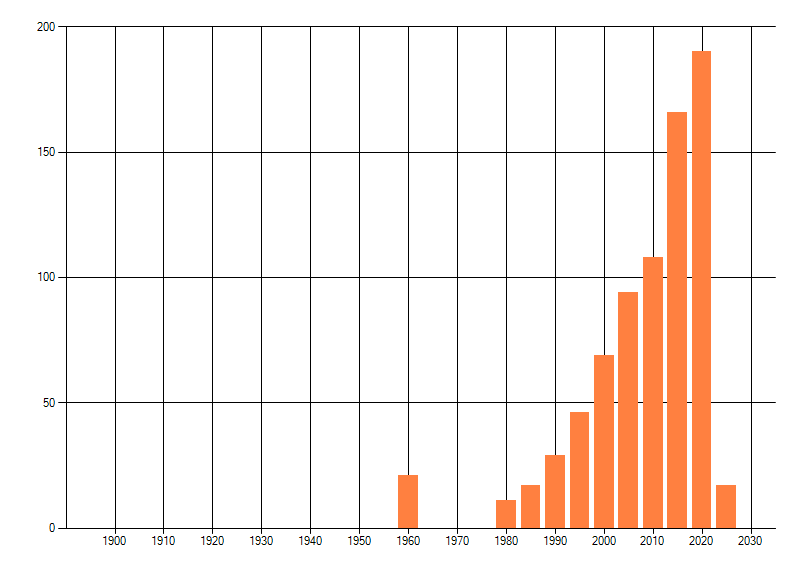 Het aantal atlasblokken (5x5 km) waarin de soort is gemeld binnen een periode van vijf jaar (vanaf 1980) of twintig jaar. Niet gecorrigeerd voor waarnemersinspanning en het aantal doorgegeven waarnemingen kan sterk variëren per periode, dus een trend in verspreiding kan hier niet direct uit worden afgelezen. Het opgegeven jaartal is het eerste jaar van de periode. Bron: gevalideerde waarnemingen uit de NDFF.