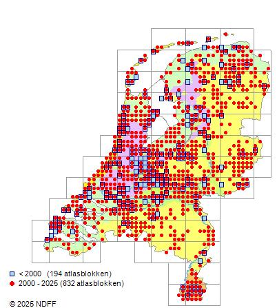 Het aantal atlasblokken (5x5 km) waarin de soort is gemeld binnen een periode van vijf jaar (vanaf 1980) of twintig jaar. Niet gecorrigeerd voor waarnemersinspanning en het aantal doorgegeven waarnemingen kan sterk variëren per periode, dus een trend in verspreiding kan hier niet direct uit worden afgelezen. Het opgegeven jaartal is het eerste jaar van de periode. Bron: gevalideerde waarnemingen uit de NDFF.