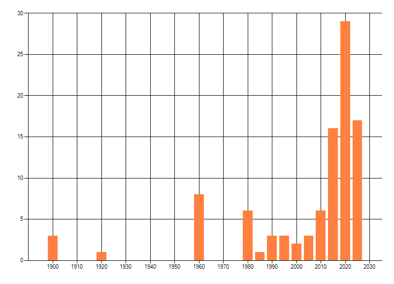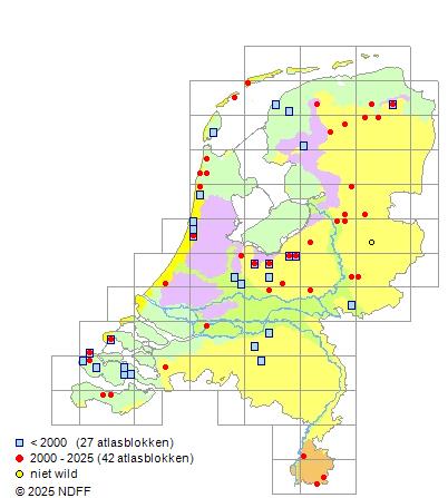 Het aantal atlasblokken (5x5 km) waarin de soort is gemeld binnen een periode van vijf jaar (vanaf 1980) of twintig jaar. Niet gecorrigeerd voor waarnemersinspanning en het aantal doorgegeven waarnemingen kan sterk variëren per periode, dus een trend in verspreiding kan hier niet direct uit worden afgelezen. Het opgegeven jaartal is het eerste jaar van de periode. Bron: gevalideerde waarnemingen uit de NDFF.